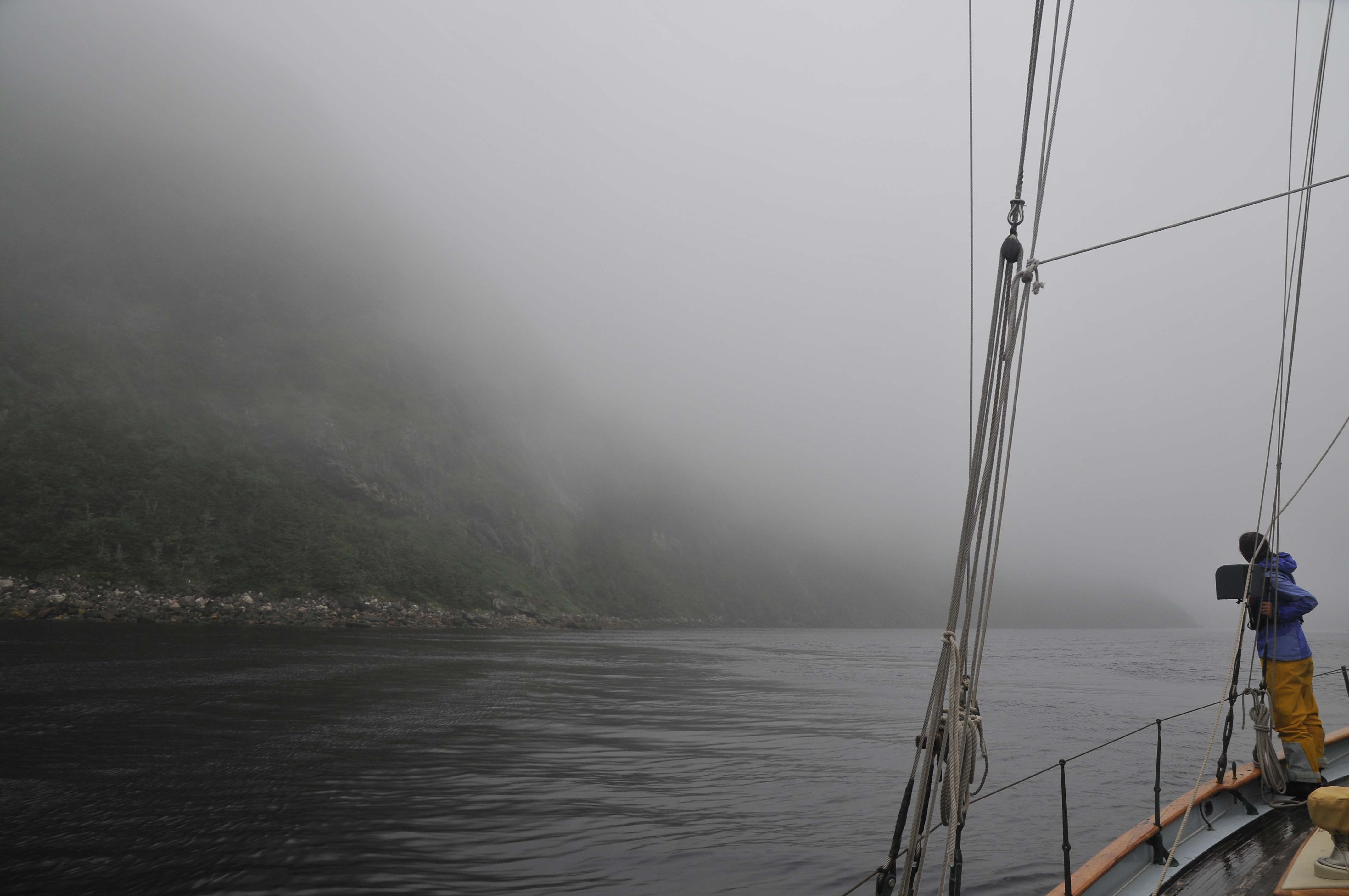 It began as a 400’ cleft in a two thousand foot high cliff, completely shrouded in fog. We could make out the passage on the radar, but when the bright white breaking waves appeared less than 100’ off the bow, and all I could see was sheer rock, my courage left me wobbling in the knees. With an on-shore breeze, I have to admit, there was nothing other than faith in our electronic chart plotter and radar to hold on to as we passed in from the sea; blinded by fog with rock and waves all about us. But as we entered first the sea swell disappeared, then the wind vanished. We turned gently to starboard and the fog lessened it’s grip on our vision allowing the great walls of Grey River Fjord appeared, as if by magic. It was truly an awe inspiring moment in which the adrenaline of fear gives way, leaving you speechless in the presence of extraordinary beauty. If I was a religious man I might have seen god in the space between fear and awe, but as I’m not, it was big mama earth that brought forth my primeval roar! And I just kept roaring until the small outport village of Grey River appeared, nestled in it’s steep valley.
