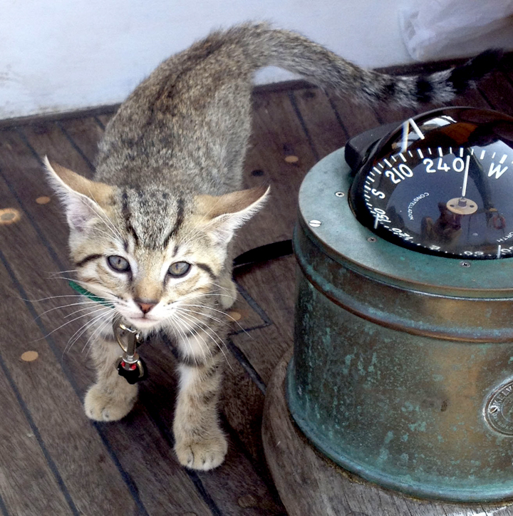 Leroy is the newest member of our crew and joined us in July 2015. As a kitten he enjoyed running around the deck, climbing up on the sails and sitting in the companionway while sailing. He is a surprisingly apt swimmer and has successfully climbed back on the boat himself a few times now. After winter on land he was extremely unhappy back on the boat but tolerated it a second year. He stayed on land the last two summers and has gone on some long adventures running away from where we put him. He now sports a GPS collar and we hope will stay put.