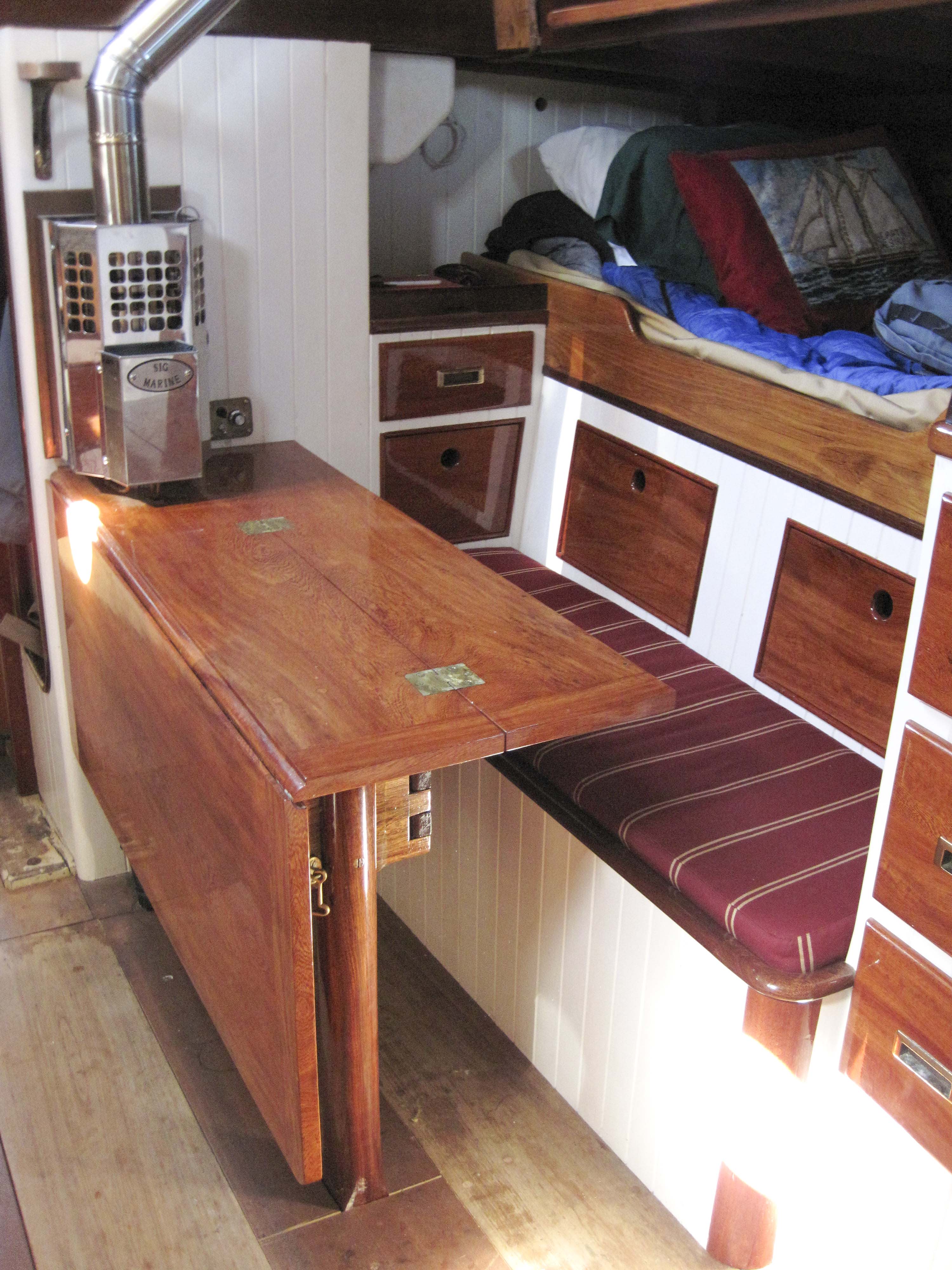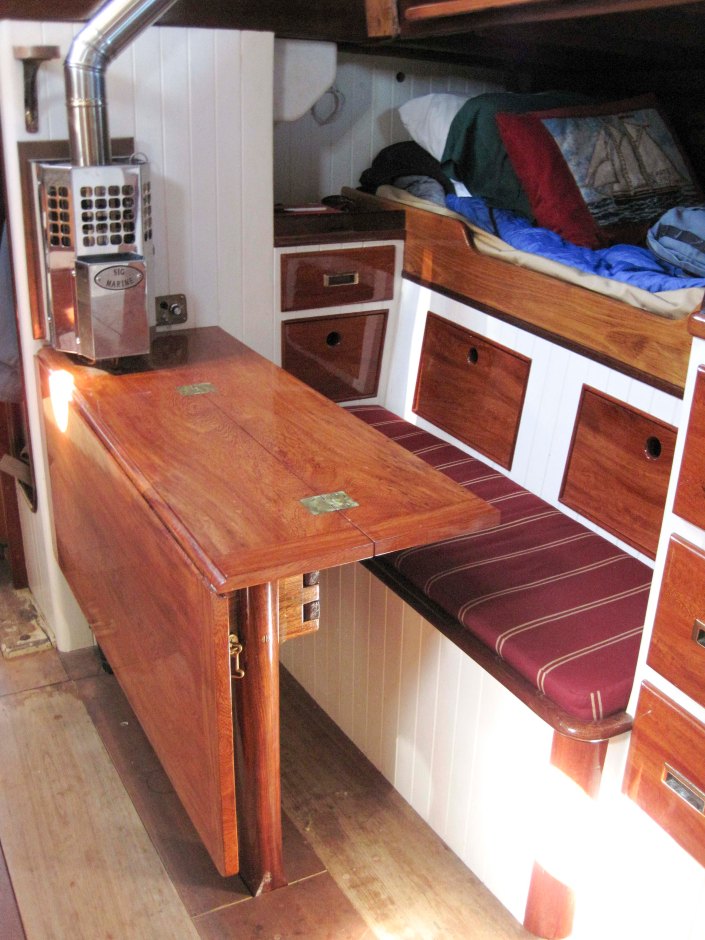 Main cabin facing back with diesel cabin heater.